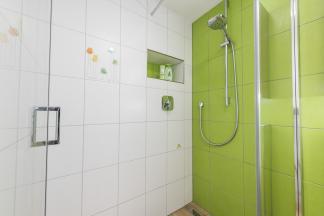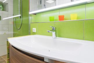 „Grün, grün, grün sind alle meine Fliesen“ – nach der Renovierung zeigt sich das neue Bad von seiner farbenfrohen Seite.
