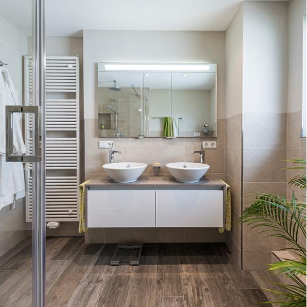 Stress am Morgen kommt hier nicht auf: An den beiden Duravit Waschbecken mit den Hansgrohe AXOR Citterio Armaturen haben Marie-Luise Hölzles Kunden genügend Platz und Entfaltungsmöglichkeiten. Auch der flächenbündig eingebaute Spiegelschrank sorgt nicht nur für ein entspanntes Miteinander, sondern schafft unaufdringlich und bescheiden auch zusätzlichen Stauraum.