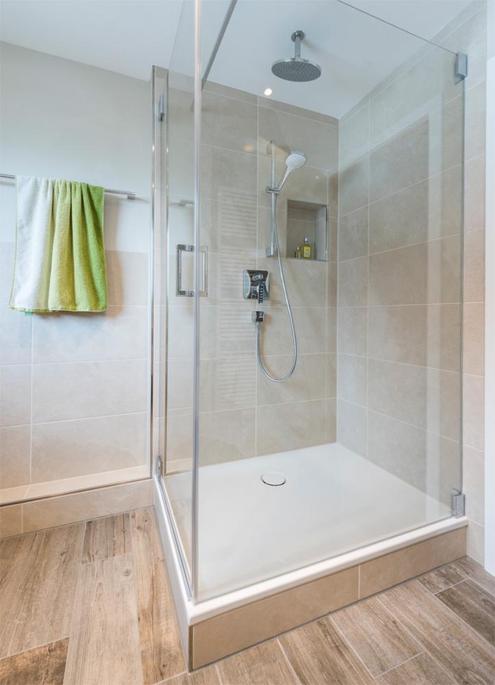 Das Bad-Konzept setzt auf ein heimeliges Flair, überzeugt aber dennoch mit einer schlichten Eleganz. Während im alten Badezimmer noch Badewanne und Dusche vorhanden waren, setzte Badplanerin Maria-Luise Hölzle gezielt auf das Weglassen der Wanne. Somit schafft der neu gewonnene Raum und Platz optimale Bedingungen für eine barrierefreie, geräumige Dusche.