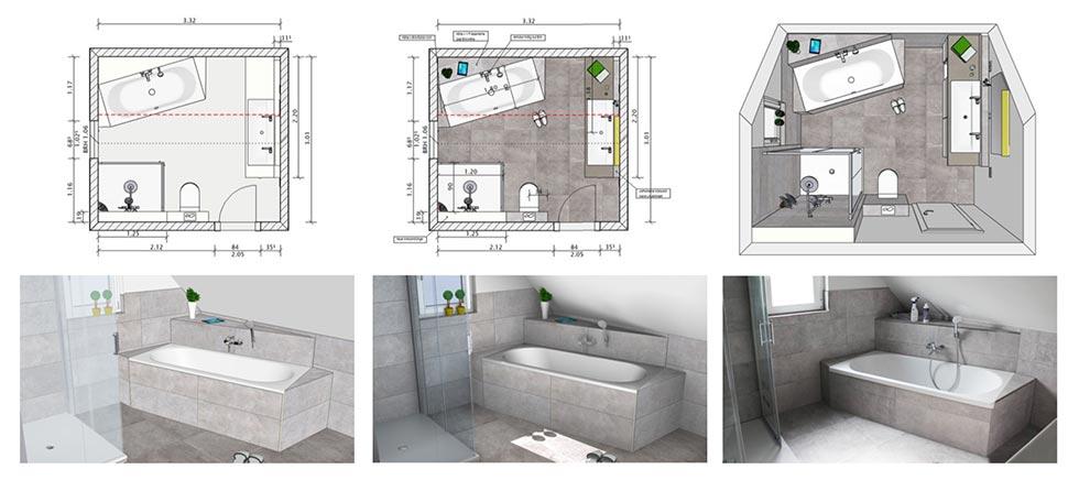 Diese 6 Bilder zeigen Ihnen als Beispiel die Schritte der Badplanung von der vermassten Skizze zum 3D Bad. Sie können Ihr zukünftiges bad aus allen gewünschten Blickwinkeln virtuell von innen ansehen. Gefällt es Ihnen noch nicht optimal können wir die Planung problemlos anpassen. Diese Art der Badplanung gibt Ihnen größtmögliche Sicherheit über das spätere Aussehen Ihres Bades.